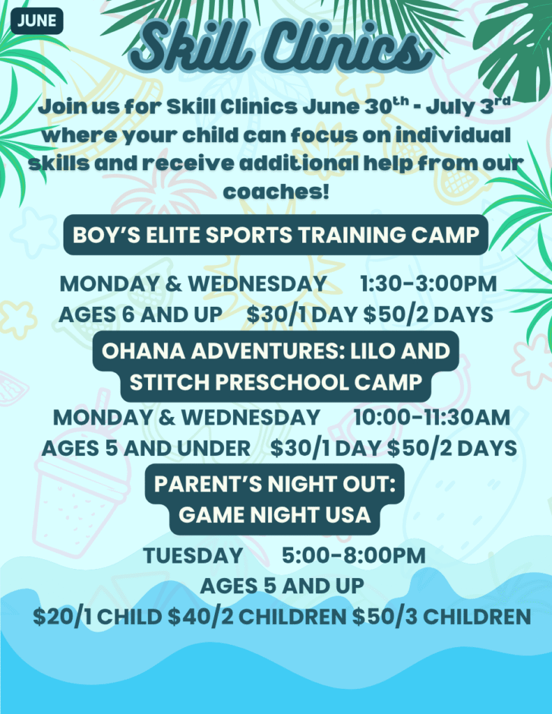 June is here—and the fun is just getting started! With classes, camps, clinics, and open gyms running all summer long, there are endless ways to stay active and engaged. Check out what’s happening this month and don’t miss a moment!